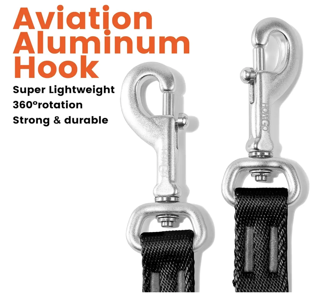 【Nylon & Aviation Aluminum】 : Crafted from 100% durable nylon, this leash is strong and comfortable for both pets and owners. The leash also features lightweight aviation aluminum hooks that reduce weight by over 40%. These strong, practical hooks not only enhance the leash’s sleek appearance but also keep it tangle-free.